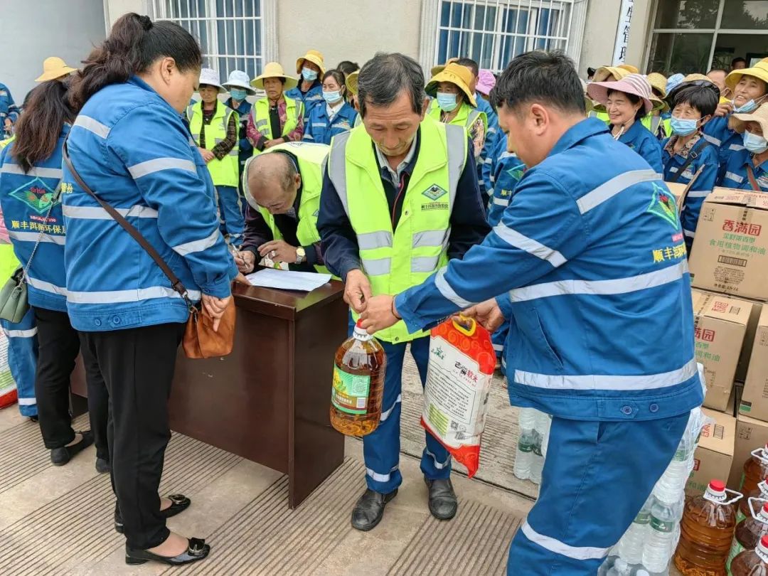 為一線環(huán)衛(wèi)工人發(fā)放大米、食用油等慰問物品。