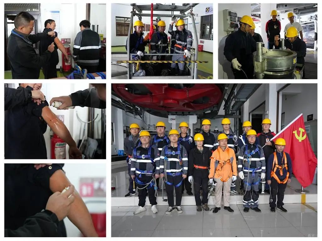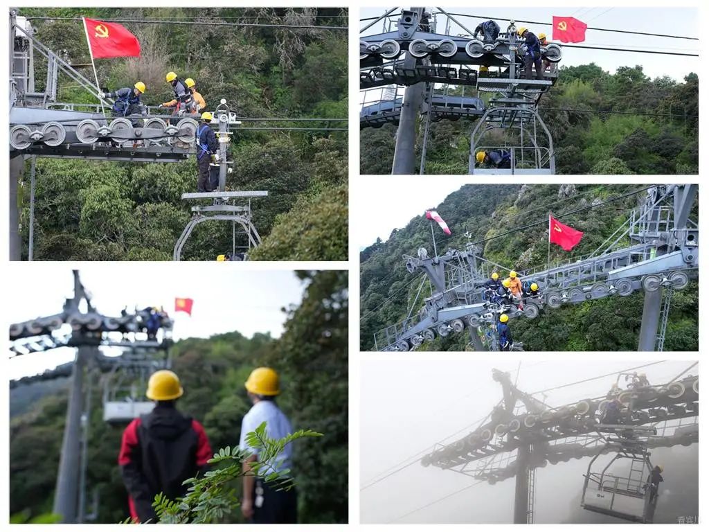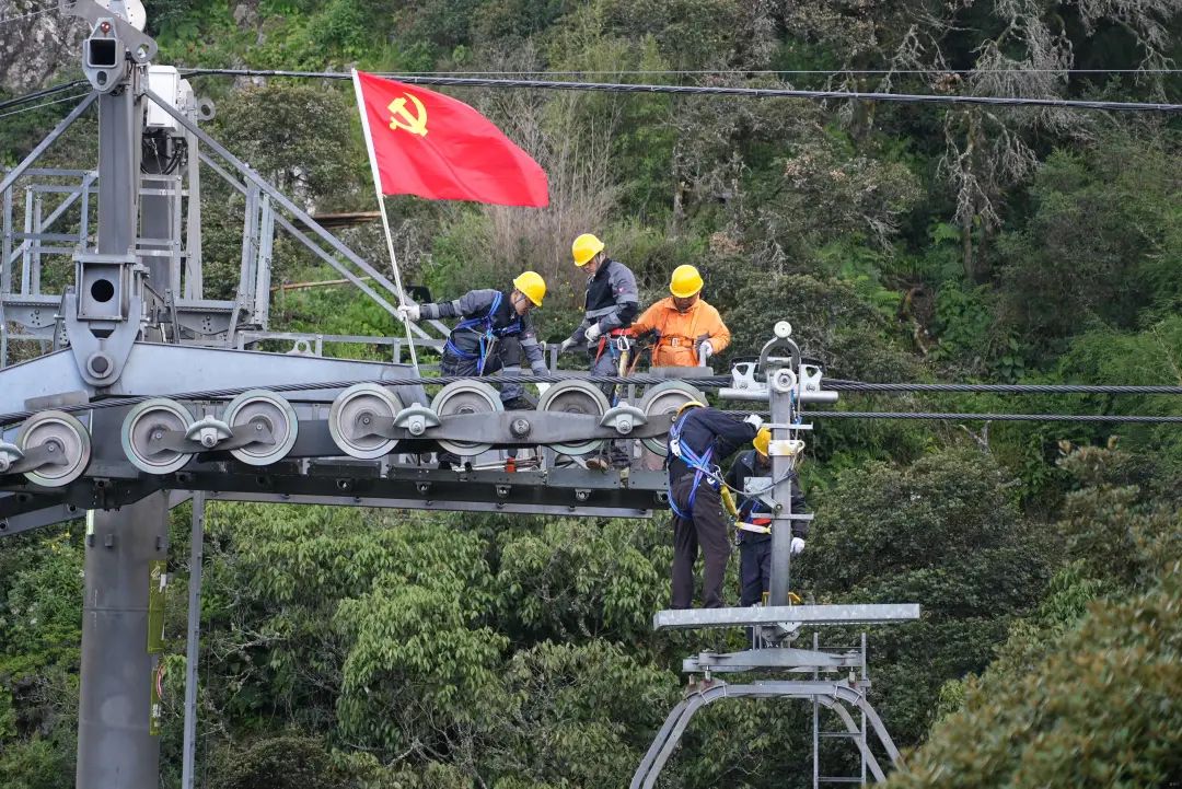 一面鮮紅的黨旗迎風(fēng)飄揚(yáng)在大理州企業(yè)家協(xié)會副會長單位——大理旅游集團(tuán)下屬的賓川雞足山索道34米高的支架上,旁邊五六個檢修師傅正在認(rèn)真細(xì)心地進(jìn)行著索道更換支架輪襯及潤滑保養(yǎng)工作……