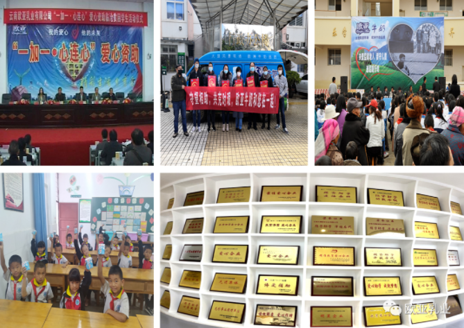 在發(fā)展自身的同時,歐亞乳業(yè)始終不忘社會哺育之恩,將“感恩”“責(zé)任”“奉獻(xiàn)”視為企業(yè)文化的精神內(nèi)核和企業(yè)行為的基本準(zhǔn)則。投產(chǎn)以來,公司帶動2萬余農(nóng)戶增收致富,在脫貧攻堅活動中,更是結(jié)合自身實際,承擔(dān)社會責(zé)任,制定措施,提供技術(shù),直接幫扶帶動大理州內(nèi)各縣市建檔立卡貧困戶594戶2299人脫貧致富,因聯(lián)農(nóng)帶農(nóng)效果顯著,公司所有產(chǎn)品均被選入《全國扶貧產(chǎn)品目錄》;在公益事業(yè)方面,主要通過捐資捐物助推貧困地區(qū)教育事業(yè)發(fā)展,勉勵學(xué)子奮發(fā)圖強(qiáng),勇敢逐夢。新冠疫情爆發(fā)之際,公司在緊抓復(fù)工復(fù)產(chǎn),保障優(yōu)質(zhì)乳品充足供應(yīng)的同時,主動向武漢、上海等疫情嚴(yán)重地區(qū)以及一線防疫工作者捐贈牛奶、酒精等物資,積極融入疫情防控大局;在抗震、抗旱、消防救火等方面,公司也竭盡所能提供幫助,以切實行動踐行初心使命,展現(xiàn)擔(dān)當(dāng)作為,多年來,共向社會捐款捐物近兩千萬元。公司長期堅守公益初心,被大理州扶貧開發(fā)領(lǐng)導(dǎo)小組評為“扶貧濟(jì)困 愛心企業(yè)”,被大理州扶貧辦評為“扶貧助學(xué)愛心企業(yè)”,被大理州工商聯(lián)、大理州光彩事業(yè)促進(jìn)會評為“光彩事業(yè)先進(jìn)單位”。