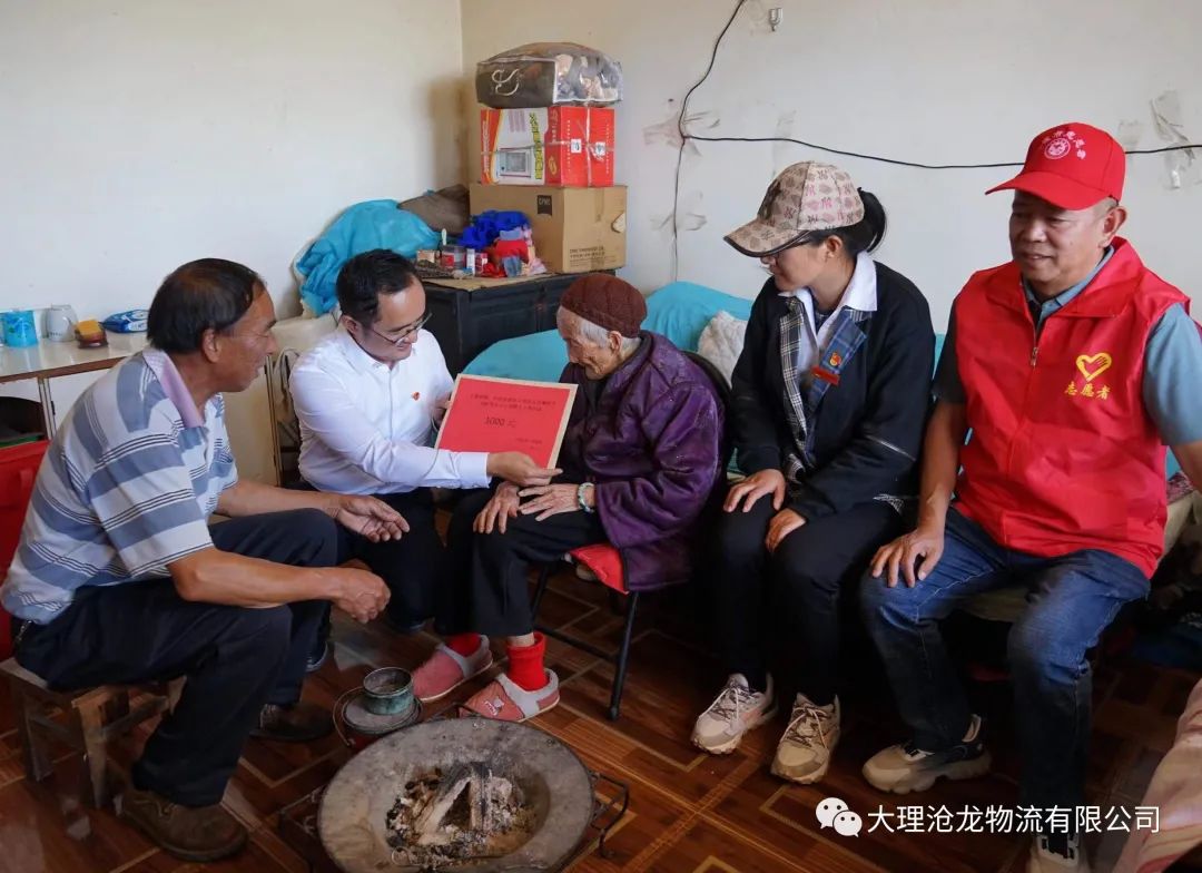 活動中,大理滄龍物流有限公司代表和太邑鄉(xiāng)政府領(lǐng)導(dǎo)、者摩村委會領(lǐng)導(dǎo)等一同看望慰問了村里的百歲老人。大家在老人家中,與老人面對面交流,嘮家常,仔細(xì)了解老人的身體狀況和生活情況。