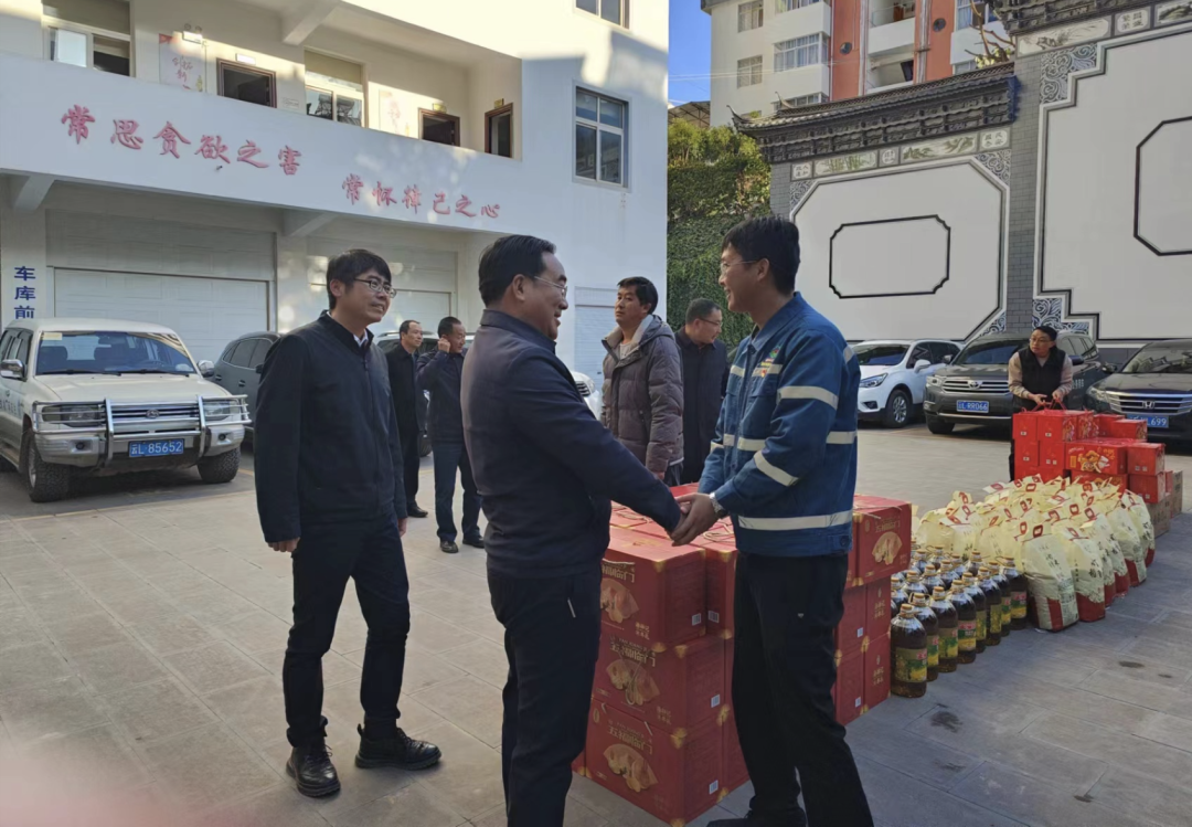 1月18日,云龍縣委書記任敏、縣委副書記、縣長白慶武、縣人大主任張伯川、縣政協(xié)主席李俊剛、縣人民政府常務副縣長楊紫江、縣委常委、縣委辦主任段躍紅、縣人民政府副縣長黎云松戲班子領導組成的一行到大理州企業(yè)家協(xié)會常務副會長單位——順豐洱海環(huán)保下屬企業(yè)云龍縣順豐洱海環(huán)??萍加邢挢熑喂鹃_展2024年春節(jié)送溫暖慰問活動。