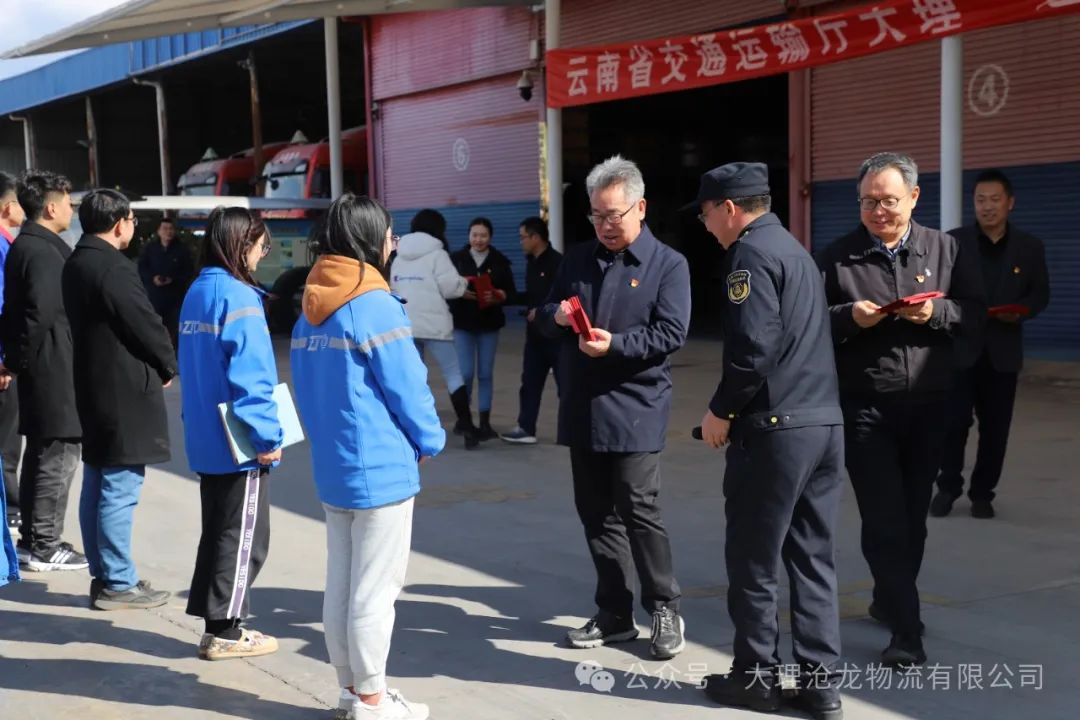 1月22日,由云南省交通運(yùn)輸廳黨組成員、副廳長馬德芳,廳二級巡視員歐陽學(xué)兵,廳工會主席王順才,廳督查員、省交通運(yùn)輸行業(yè)黨委專職副書記孫藝瑗,廳直屬機(jī)關(guān)黨委(人事處)一級主任科員汪婭杰,省交通運(yùn)輸行業(yè)黨委一級主任科員陳垚天,省綜合交通發(fā)展中心工作人員趙傳昕組成的調(diào)研組來到大理開展交通運(yùn)輸新業(yè)態(tài)、新就業(yè)全體黨建工作調(diào)研及送溫暖慰問活動。大理州企業(yè)家協(xié)會常務(wù)副會長單位——大理滄龍物流有限公司有幸受邀參加了活動。