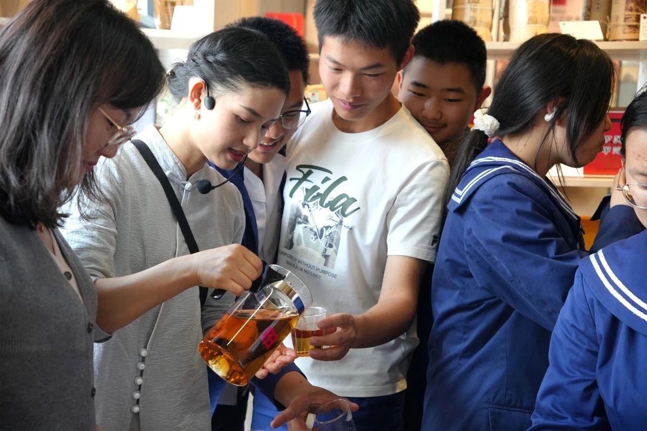 大家走到第四個展廳的時候,下關(guān)沱茶館的工作人員早已準備好了下關(guān)沱茶的熟茶以及白茶,以供老師、家長和同學們品飲。“一杯醇香的普洱茶,入口苦澀,而后又成甜的,像是在品位歷經(jīng)歲月的智慧與沉淀,這次寶貴的經(jīng)歷,讓我有機會用心地品位體驗了下關(guān)的普洱茶,對它的喜愛已經(jīng)油然而生。”喝完下關(guān)沱茶,181班的華彩依同學表達了自己最真實的感受。