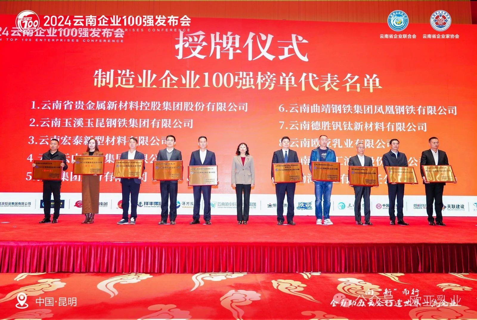 11月22日下午,由云南省企業(yè)聯(lián)合會(huì)、云南省企業(yè)家協(xié)會(huì)主辦的“2024云南企業(yè)100強(qiáng)發(fā)布會(huì)”在昆明海埂會(huì)堂隆重舉行,大理州企業(yè)家協(xié)會(huì)理事單位——云南歐亞乳業(yè)有限公司被授予“云南企業(yè)100強(qiáng)”“云南制造業(yè)企業(yè)100強(qiáng)”雙百?gòu)?qiáng)榮譽(yù),公司常務(wù)副總馬紫怡出席會(huì)議并代表公司領(lǐng)取獎(jiǎng)項(xiàng)。