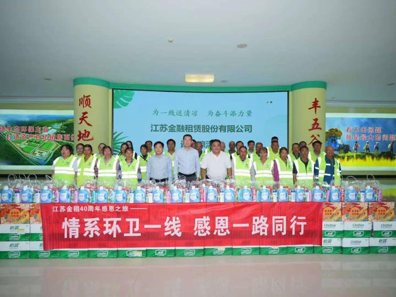 江蘇金租領(lǐng)導(dǎo)一行為一線環(huán)衛(wèi)工人發(fā)放飲用水、金龍魚大禮包、洗漱包等慰問(wèn)品。