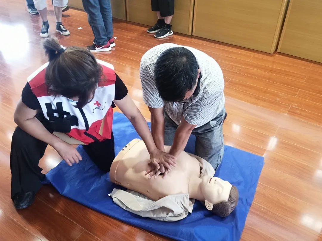 培訓(xùn)現(xiàn)場,老師演示了如何在搶救的黃金時(shí)間給生命垂危的人做心肺復(fù)蘇、解除氣道異物阻塞的急救方法,并對(duì)人體不同部位止血包扎的正確處理方法進(jìn)行了示范操作、情景互動(dòng)和不規(guī)范動(dòng)作糾正。通過現(xiàn)場互動(dòng)演示,讓大家更直觀地學(xué)習(xí)到了規(guī)范的急救流程和正確的處置方法。