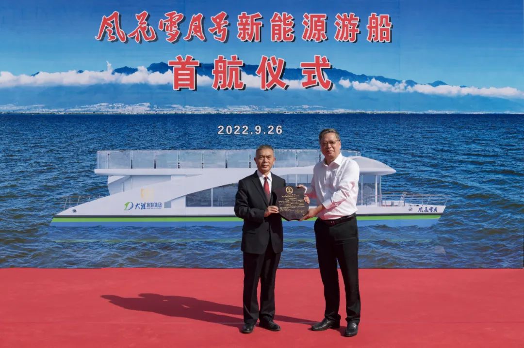 大理州人民政府副州長魯旭俊主持了“風花雪月號”新能源游船首航儀式,中國船籍社重慶分社處長潘斌為“風花雪月號”授牌,大理旅游集團黨委副書記、總經(jīng)理唐輝接牌。