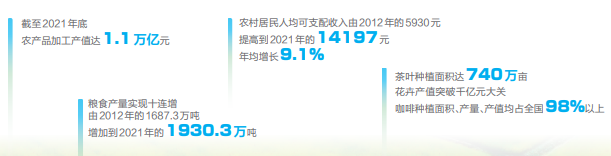鄉(xiāng)村產(chǎn)業(yè)興旺,家園美麗宜居,農(nóng)民幸福安康,一幅紅紅火火的農(nóng)業(yè)農(nóng)村現(xiàn)代化圖景在云嶺鋪展。黨的十八大以來的十年,云南農(nóng)業(yè)迎來了高速發(fā)展的“黃金十年”。