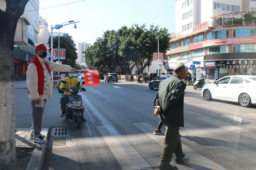 在下關(guān)城區(qū)重點(diǎn)路段都能看到志愿者們的身影,他們身穿紅色馬甲,頭戴志愿帽,手持“文明勸導(dǎo)”交通指揮旗,從早上7點(diǎn)到下午7點(diǎn),在凜冽寒風(fēng)與灼灼烈日下堅(jiān)守在文明勸導(dǎo)崗位上,協(xié)助交警維持交通秩序,勸導(dǎo)行人在人行道內(nèi)行走,不闖紅燈、不隨意橫過(guò)道路,不翻越隔離護(hù)欄等,營(yíng)造了安全暢通的交通環(huán)境。