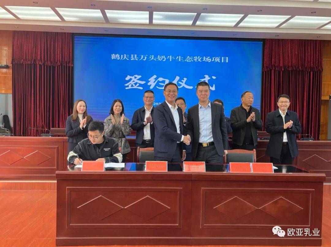 為加快綠色奶源基地建設(shè),提高優(yōu)質(zhì)原料奶供應(yīng)量,大理州企業(yè)家協(xié)會理事單位——云南歐亞乳業(yè)有限公司繼2015年在鶴慶縣金墩鄉(xiāng)北溪村投資建設(shè)萬頭國家級奶牛標準化示范場后,11月8日,又與鶴慶縣政府簽定投資協(xié)議,新建一個存欄11000頭娟姍奶牛的有機生態(tài)牧場。大理州政府黨組成員、一級巡視員吉向陽,鶴慶縣四班子領(lǐng)導(dǎo),縣級相關(guān)部門負責人等領(lǐng)導(dǎo)出席儀式,歐亞乳業(yè)公司董事長彭金國及管理人員參加儀式。