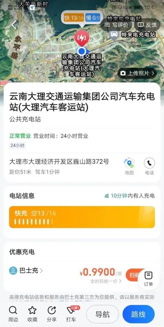 為進一步增強推廣的效果和知曉度,大理汽車客運站在集團公司安全管理中心的技術支持下,高德地圖搜索引擎功能同期上線。線上地圖便于客戶查找位置,也能吸引廣大新能源車主進站充電,進一步擴大了信息覆蓋面和精準性。