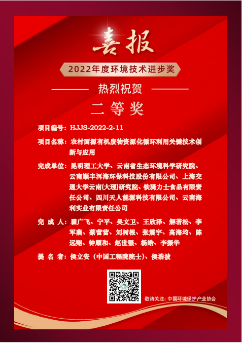 云南順豐洱海環(huán)保農(nóng)村面源有機(jī)廢物資源化循環(huán)利用關(guān)鍵技術(shù)榮獲2022年度環(huán)境技術(shù)進(jìn)步二等獎(jiǎng)